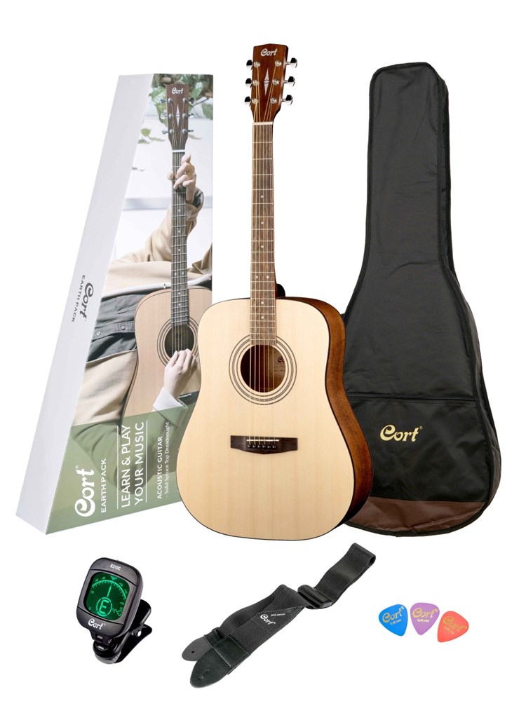 Набор включает в себя акустическую гитару типа дредноут, мягкий чехол, хроматический тюнер-клипсу Cort e310c и три медиатора толщиной 0.46мм.