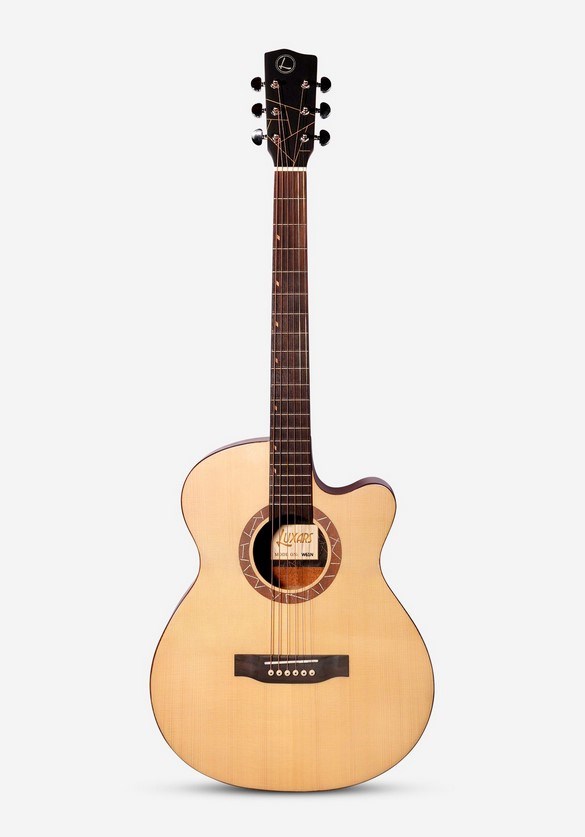 Верхняя дека изготовлена из ели с тонкой и богатой текстурой. Эта древесина обладает отличными резонансными характеристиками, что делает тон инструмента чище и ярче. Будь то четкие арпеджио или страстный перебор, она может демонстрировать богатую многослойность. Задняя дека выполнена из красного дерева. Этот материал наделяет гитару тёплыми и мягкими средне-низкими частотами, делая звук более полным и округлым. Гриф изготовлен из красного дерева окоуме, прочной, стабильной и долговечной древесины. Накладка грифа из палисандра не только элегантна внешне, но и обеспечивает комфортные ощущения при игре, позволяя пальцам двигаться свободно и плавно. Вырез корпуса облегчает доступ к высоким ладам.