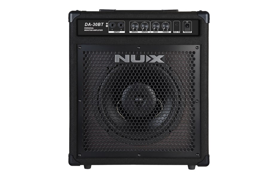 NUX DA-30BT оснащен усилителем мощности 30 Вт, и 10" широкополосным динамиком. Частотная характеристика отлично подходит для разнообразных ударных инструментов, яркие высокие частоты, насыщенный бас. Двухполосный эквалайзер позволяет настроить звучание. DA-30BT оснащен Bluetooth подключением, что позволяет музыканту проще играть свои песни с усилителем.